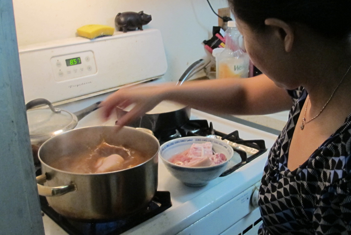 mụ vợ tui nấu bún bò giò heo, mà lại theo ý tui, có nghĩa là mấy cục giò không được để lửa lâu, rục quá mất ngon, ăn ớn lắm. Giò tui thích, khi cắn vào phải dòn, gân tuy đã mềm nhưng phải dính vào xương, bảo đảm không cầm tay, ăn không được. Sau này mỗi lần làm món này mụ vợ tui hay nhắc, lần trước nấu bún có bác Hoàng, bác Lộc TĐ, ghé, mụ ham loay hoay nhiều việc nên quên tắt lò sớm làm thịt bị rục hết cả. Mụ tiếc lắm nhưng tui an ủi, rằng chỉ mất ngon đối với tui thôi chứ mấy ông cụ kia có ai phản ứng chi mô, ai cũng làm sạch phần mình đó mà.