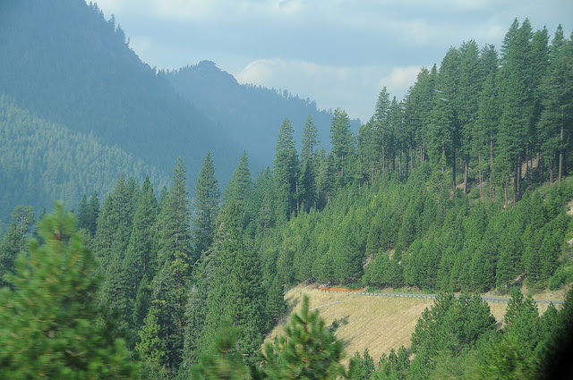 Đường lên gần hồ Tahoe cao dần, cao dần, cảnh gần giống như đoạn đèo Ngoạn-Mục (hay còn gọi là đèo Kroong-Pha lên Đà-Lạt vậy. Đây là vùng ôn đới, nên toàn là những cây cổ thụ thông rất già. Một bên là núi thật cao, 1 bên là thung lũng thật sâu, có những đoạn đèo cua “cùi chỏ” giống ở đèo Hải-Vân hay Kroong-Pha vậy VN vậy, lái xe rất nguy hiểm, nên tài xế phải cẩn thận và tay lái phải cứng mới dám đi.