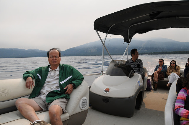 Water ski thuê 1 chiếc 150 đô Mỹ, 3 tiếng. Bọn “lóc nhóc” trong đoàn mới bon chen đi. Còn các bô lão như Viễn-Cẩm thuê thuyền này đi chắc ăn hơn, khỏi sợ nước làm hư máy móc …Lại rẽ nữa 150 đô, đi 15 người, 3 giờ đồng hồ lận, tha hồ lái …mệt thì nghĩ, không ai la cả mà lo… Hè! Hè!! Hè!!!
