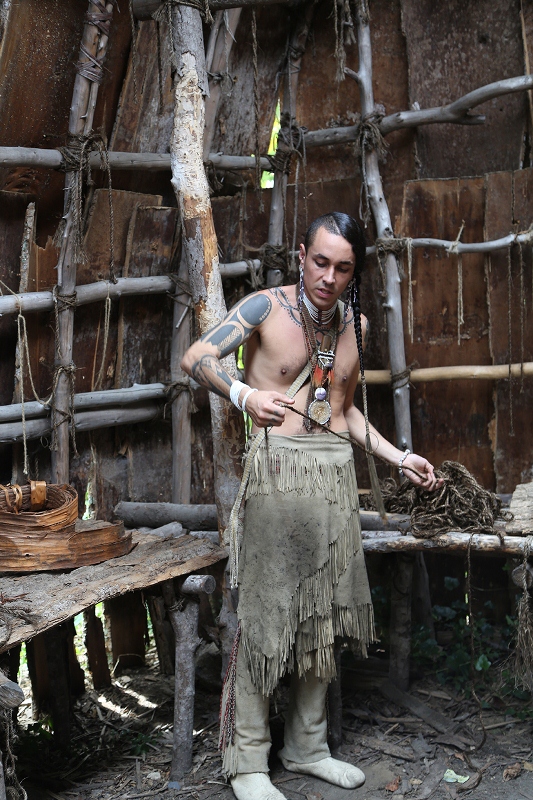 Thổ dân bộ lạc Wampanoag thế kỷ 17 đang vót mây hay một loại tranh hoặc lau lách chi đó để đan đồ dùng.