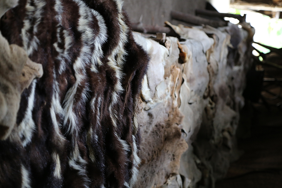 Phụ nữ dùng các loại da thú đã thuộc để may (hay kết?) áo quần cho gia đình hay cả bộ tộc.