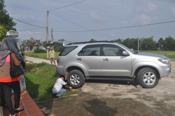 Khi lùi xe để trở đầu thì một sự cố nhỏ xảy ra: một bánh sau bị sụp hố ngay trước đền. Cả bọn loay hoay tìm gạch, đá kê bánh để kích lên. May sao, khi trùng tu đền người ta bỏ lại mấy thanh gỗ và vài tảng bê tông. Khoảng 20 phút sau thì xe leo lên khỏi mương nước, tiếp tục cuộc hành trình.