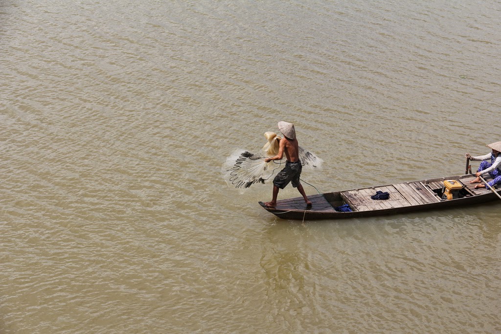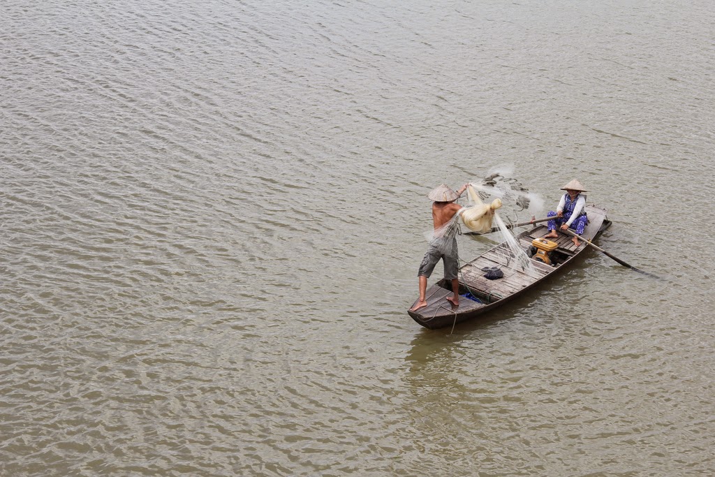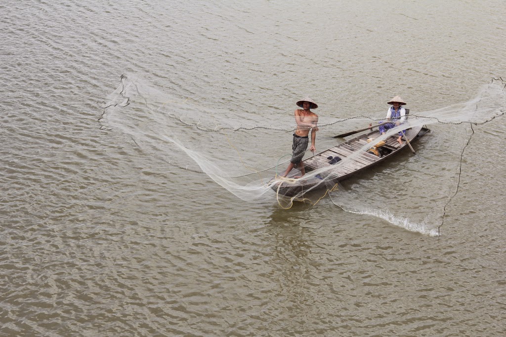 Những tấm ảnh người vợ chèo thuyền và người chồng tung lưới bắt cá thật hay.