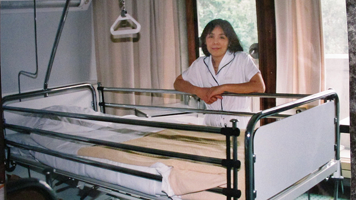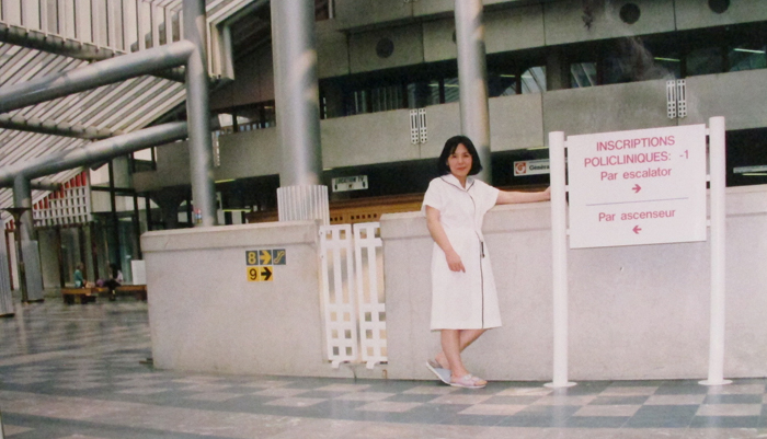 Xuân Phương chụp ở mặt tiền bệnh viện Sart Tilman, Liège, Belgique, năm 1989. (Hình: LocDP)