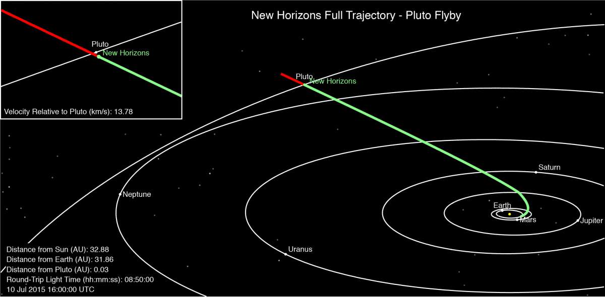 Đường bay của New Horizons từ trái đất, được tính toán, sau 9 năm rưỡi bay, gặp Pluto trên quĩ đạo quanh mặt trời của nó.
