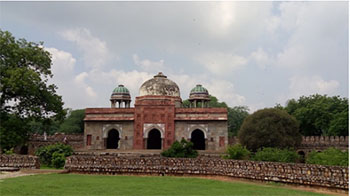 Lăng mộ Mughal cổ đại: tối tăm, êm ả. Rất nhiều chim bồ câu bay trên bầu trời nhiều mây.