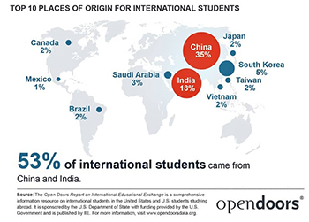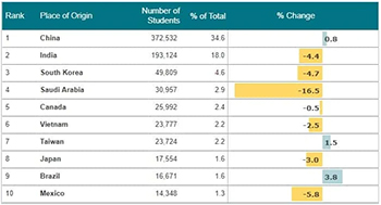 Trung Quốc đứng đầu nhóm 10 quốc gia, vùng lãnh thổ có số lượng du học sinh lớn nhất tại Mỹ, chiếm 34,6% tổng số du học sinh quốc tế. Tiếp đến là Ấn Độ (18%), Hàn Quốc (4,6%), Ả rập Saudi (2,9%), Canada (2,4%), Việt Nam (2,2%), Đài Loan (2,2%), Nhật Bản (1,6%), Brazil (1,6%), Mexico (1,3%).
