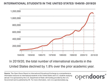 Theo IIE, trong năm học 2019-2020, tổng cộng du học sinh tại Mỹ đã giảm 108.000 người, trong đó, số lượng du học sinh quốc tế giảm 19.803 người so với năm học 2018-2019, tăng -1,8%.