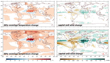 This massive new heat source in the Sahara reorganizes global air and ocean circulation, affecting precipitation patterns around the world. The narrow band of heavy rainfall in the tropics, which accounts for more than 30% of global precipitation and supports the rainforests of the Amazon and Congo Basin, shifts northward in our simulations. For the Amazon region, this causes droughts as less moisture arrives from the ocean. Roughly the same amount of additional rainfall that falls over the Sahara due to the surface-darkening effects of solar panels is lost from the Amazon. The model also predicts more frequent tropical cyclones hitting North American and East Asian coasts.