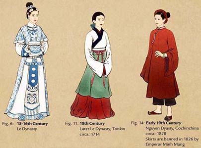 Nhìn một người phụ nữ An Nam bước qua không thích thú lắm; bà ta bước tới với hai cánh tay đu đưa dọc theo thân mình, lắc qua lắc lại bên phải hay bên trái. Về trang phục, một áo dài, cỗ cao, phía trước may kín, vừa giữ vai trò áo khoác ngoài và áo mặc trong (áo trắng lúc tang chế, và lúc đó đội thêm khăn tang trắng),một cái quần, trắng hoặc đen, làm bằng vải gòn thô hoặc lụa, vài đôi khi kèm theo thắt lưng đỏ hoặc xanh; đi chân đất, hiếm khi đi hài mũi cong và nhiều trang trí.