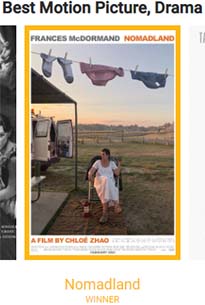 Kết quả giải Cầu Vàng lần thứ 78 (78th Golden Globe) cho năm 2021 với “Nomadland” được bầu là phim hay nhất (Best Picture), phim thuộc thể loại Drama, trong khi Chloé Zhao trở thành người phụ nữ thứ nhì từng được thắng giải Best Director, cho vai trò đạo diễn của cuốn phim.