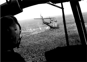Hợp đoàn đang hạ cao độ chuẩn bị đáp. Đằng trước, không xa, một trảng cỏ xanh lá mạ vây bọc xung quanh rừng cây cao, một làn khói vàng đang vươn lên. Không còn có sự chọn lựa nào khác hơn là tiếp tục thi hành phi vụ, tôi cố quên đàng sau khoang tàu có hai cô gái đang ngồi. Tôi cho hai chiếc gun kẹp sát hai bên hông hợp đoàn, bắt đầu cuộc oanh kích yểm trợ.