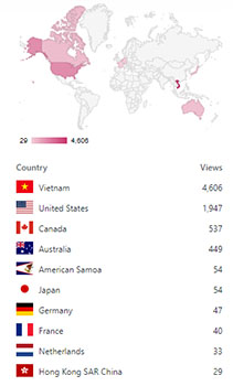 Việt Nam (4.606), Hoa Kỳ (1.947), Canada (537), Úc (449), Samoa (54), Nhật (54), Đức (47), Pháp (40), Hòa Lan (33), Hồng Kông (29), Singapore (22), Nam Hàn (16), China (13), Đài Loan (12), Thụy Sĩ (11), Anh (8), Thái Lan (7), Bangladesh (7), Nam Phi (4), Ái Nhĩ Lan (3), Hungary (3), Macau (2), Ai Cập (2), Indonesia (2), Ý (2), Nga (2), New Zealand (2), Lào (2), Tây Ban Nha (2), và một lượt cho mỗi nước sau, gồm : Bỉ, Ghana, Israel, Ba Lan, Panama, Đan Mạch, Argentina, Căm Bốt, Thụy Điển, Zimbabwe, Malaysia, Tiệp Khắc, Phần Lan, Bahamas, và Liên Âu.