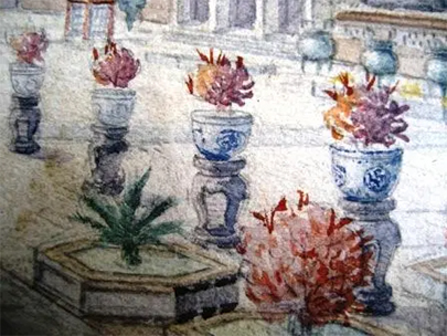 Họa sĩ Tôn Thất Sa đã dùng kỷ thuật hội họa vẽ tỉ mĩ những gì đã quan sát được và trung thực ghi lại bằng màu sắc. Hãy xem các chậu cảnh bằng sứ xanh trắng với vài nét chấm phá đủ mô tả rồng uốn lượn trên vòng tròn. Các chậu sứ nầy tôi còn nhìn thấy được vào những năm 1965 nay còn đâu?
