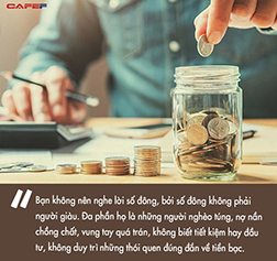 Bạn không nên nghe lời số đông, bởi số đông không phải người giàu. Đa phần họ là những người nghèo túng, nợ nần chồng chất, vung tay quá trán, không biết tiết kiệm hay đầu tư, không duy trì những thói quen đúng đắn về tiền bạc.