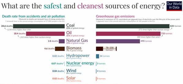 Nguồn cung cấp năng lượng của thế giới ngày nay không an toàn và không bền vững. Hiện nay nhiên liệu hóa thạch – than, dầu và khí đốt – chiếm 79% sản lượng năng lượng của thế giới, và như biểu đồ bên dưới (hình 1)cho thấy, chúng có những tác dụng phụ rất tệ hại. Cột bên trái biểu thị tỉ-lệ người chết, và cột bên phải so sánh lượng khí thải nhà kính từ các nguồn năng lượng, cho thấy hai điều rõ rệt: (1) Vì việc đốt nhiên liệu hóa thạch chiếm 87% lượng khí thải CO2 của thế giới, một thế giới hoạt động bằng loại nhiên liệu hóa thạch sẽ không bền vững, chúng gây nguy hiểm cho cuộc sống, và sinh kế của các thế hệ tương lai. (2) Chính những nguồn năng lượng hóa thạch dẫn đến cái chết của nhiều người hiện nay: ô nhiễm không khí do đốt nhiên liệu hóa thạch đã giết chết 3,6 triệu người mỗi năm ở các nước trên thế giới; con số này cao gấp 6 lần tổng số người chết hàng năm vì tất cả các vụ giết người, cộng với số người chết vì chiến tranh và các vụ tấn công khủng bố.