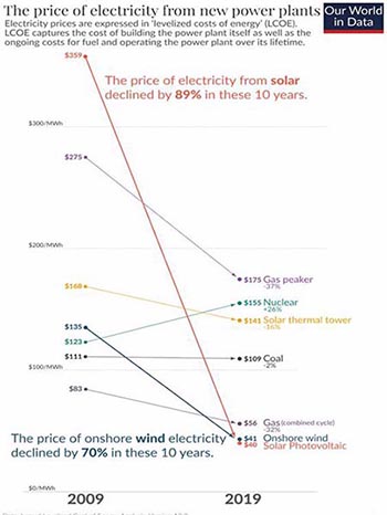 Điện từ năng lượng mặt trời quy mô nhỏ tiện dụng đã là 359 USD cho mỗi MWh vào năm 2009. Vậy mà chỉ trong vòng một thập kỷ, giá đó đã giảm 89%, chỉ còn là 40 USD. Khiến giá cả đảo ngược: giá điện tối thiểu để hòa vốn cho nhà máy than mới hiện nay cao hơn rất nhiều so với nhà máy năng lượng gió hoặc năng lượng mặt trời.