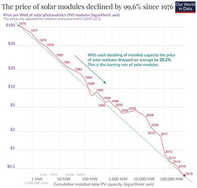 Giá của các đơn-thể năng lượng mặt trời giảm từ $ 106 năm 1976 xuống còn có $ 0,38 năm 2019 cho mỗi watt. Mức giảm đến 99,6%.