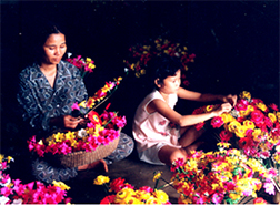 Vượt lên đầu người lố nhố đi chợ là những cây bông giấy và cây lung tung. Cây bông giấy là một đoạn tre bằng cổ tay dài không quá 2 thước, đoạn trên quấn rơm bện cắm những cành hoa giấy nhiều màu rực rỡ. Thường người ta mua hoa này để cắm ở các am thờ và ông táo xó bếp. Hoa giấy xuất phát ở nơi có tên thật đẹp là làng Thanh Tiên. Cây lung tung cũng thế, thay vì cắm hoa giấy thì cắm lung tung. Ngoài ra, còn có những chùm bong bóng bay nhiều màu được thổi căng bằng bình ga, khác bong bóng được thổi phồng từ một bơm xe đạp thường.