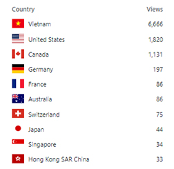 Việt Nam (6.666), Hoa Kỳ (1.820), Canada (1.131), Đức (197), Pháp (86), Úc (86), Thụy Sĩ (75), Nhật (44), Singapore (34), Hồng Kông (33), China (32), Nam Hàn (18), Na Uy (15), Bỉ (10), Anh (9), Ái Nhĩ Lan (6), Nga (6), Malaysia (6), Samoa (5), Phần Lan (5), Ấn Độ (4), Thụy Điển (4), Ecuador (4), Nigeria (3), Philippines (3), Thái Lan (3), Ai Cập (2), và một lượt cho mỗi nước sau, gồm : Ý, Tiệp, Lithuania, Martinique, New Zealand, Đan Mạch, Hà Lan, Nam Phi, Căm Bốt, Argentina, Tây Ban Nha, Đài Loan, Colombia, và Sri Lanka.