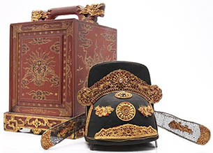Mũ có niên đại cuối thế kỷ XIX, đầu thế kỷ XX, đi kèm cả hộp đựng mũ bằng gỗ sơn son thếp vàng cũng còn nguyên vẹn.