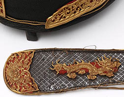 Bao hai đầu cánh mũ trên mặt trang sức con giao (con rồng 4 móng, con mãng) giỡn hạt châu bằng vàng như hình ảnh trên chiếc mũ quan văn hàm nhất phẩm trở lên của triều Nguyễn đang được đấu giá ở Tây Ban Nha.