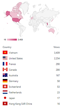 Việt Nam (3.409), Hoa Kỳ (2.254), Pháp (290), Canada (286), Úc (167), Đức (58), Thụy Sĩ (53), Hà Lan (23), Nhật (17), Hồng Kông (16), Thái Lan (14), Singapore (14), Nam Hàn (11), Ái Nhĩ Lan (10), China (6), Đài Loan (6), Anh (5), Israel (4), Phần Lan (3), Samoa (3), Ấn (3), Ba Tây (3), Căm Bốt (3), Ý (2), Ba Lan (2), Indonesia (2), và một lượt cho mỗi nước sau, gồm : Thụy Điển, New Zealand, United Arab Emirates, Morocco, Hy Lạp, Uzbekistan, Tiệp, Bồ Đào Nha, Bỉ.