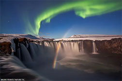 Bức ảnh này là kết hợp nhiều yếu tố kỳ diệu – ánh trăng phản chiếu cho thấy một cầu vồng tuyệt đẹp, ánh cực quang phương bắc chiếu bên trên và thác Godafoss tráng lệ ở Iceland.