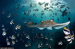 Một con cá đuối hồng lao vào chia cắt bầy cá chim được chụp dưới ánh hoàng hôn một buổi chiều muộn tại khu lặn biển Tuna Factory, ở gần Malé, thủ đô Maldives.