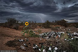 Cơn giông ập đến đằng sau một bông hoa hướng dương sống được trên bãi rác ở vùng Karoo khô cằn ở Nam Phi.