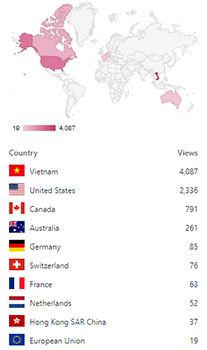 Việt Nam (4.087), Hoa Kỳ (2.336), Canada (791), Úc (261), Đức (85), Thụy Sĩ (76), Pháp (63), Hà Lan (52), Hồng Kông (37), Liên Âu (19), Ấn (17), Singapore (13), Nhật (12), Bỉ (11), Nam Hàn (9), Bồ Đào Nha (8), Israel (7), China (6), Anh (6), Na Uy (5), Phần Lan (3), Áo (2), Thổ Nhĩ Kỳ (2), Philippines (2), Ái Nhĩ Lan (2), và một lượt cho mỗi nước sau, gồm : American Samoa, Pakistan, Indonesia, Đan Mạch, Tây Ban Nha, Thụy Điển, và Ba Lan.