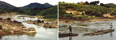 Có lẽ vì có hai hòn đảo chắn ngang dòng sông, lại thêm sông có dạng hình cung nên nước chảy chậm lại, rất thuận tiện cho dân chài lưới sống quanh bờ. Bên trái, sông âm thầm chảy qua trước đình Nghênh Lương, Kỳ đài tức Cột cờ ( Ngọ Môn năm cửa chín lầu, Cột cờ ba cấp Phu Văn Lâu hai tầng) thấp thoáng đàng sau, rồi khi đến góc đông nam Kinh thành thì trở nên nhộn nhịp với chợ Đông Ba, nguyên là Đông Hoa nhưng đọc trạnh ra để tránh tên Hồ Thị Hoa, vợ vua Minh Mệnh. Bên mặt, sông chảy qua trước trường Quốc Học, đài Trận vong tử sĩ, Bệnh viện thành phố, trường Đồng Khánh, khách sạn Saigon-Morin,…toàn những tên quen thuộc cho người sống lên ở đây. Con sông Hương quả thật là linh hồn của kinh thành Huế. Nếu sông Hương chỉ phục vụ một thành phố Huế độc nhất, những thành phố có một con sông chảy qua thì nhiều : Paris có sông Seine, Wien có sông Donau, Al-Qâhira có sông Nil, München có sông Isar,…nhưng đối với tôi không có con sông nào quyến luyến bằng con sông Hương. Những năm cầu Trường Tiền gảy, cầu Phú Xuân chưa xây, qua lại phải dùng đò. Tôi còn nhớ mãi học sinh nam nữ vọc nước chọc nhau, tiềng cười dòn dã nay vẫn còn vương vẫn trong trí óc tôi. Ưi thời tuổi trẻ nay còn đâu…