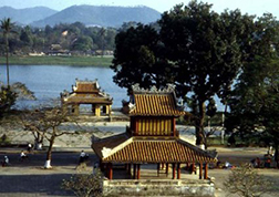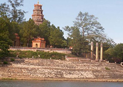 Chùa Thiên Mụ (Tiếng chuông Thiên Mụ dặn dò, Em đi cảnh vắng hẹn hò cùng ai ?) cũng như đồi Vọng Cảnh hay xa hơn núi Ngự Bình (Hương Giang in bóng trời mây, Ngự Bình đón gió tháng ngày thông reo) (8), đồi Thiên An là những nơi phong cảnh hữu tình gần thành phố thường được trai gái đem nhau lại tình tự. Sông Hương nhìn từ thềm chùa hay từ trên đỉnh tháp là cả một bức tranh sơn thủy, xa xa là dãy núi Trường Sơn xanh biếc, thấp thoáng sau những đám mây lờ lững, giữa sông là những thuyền mành nhẹ lướt trên các lớp sóng nhấp nhô cạnh những ngư phủ vừa thanh thản buông câu vừa nhẹ quậy mái chèo, thật là cảnh thái bình. Vào cuối xuân đầu hè, cây phượng trước chùa nở hoa tô thêm màu đỏ thắm làm tăng vẻ cổ kính của ngôi chùa rêu phong, lại lơ thơ rủ bóng xuống sông như để quyến rũ khách còn chần chừ trên thuyền. Về chiều, trời lại đổi sắc, mây nước đổi màu, sớm xanh, trưa vàng, chiều tím, phong cảnh mờ ảo nửa hư nửa thật, thật là nên thơ.