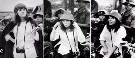 Cô đã đến Hanoi với một khuôn mặt hớn hở và thích thú, không những thế, còn diễn kịch, đội mũ sắt của quân CS, tươi cười với các người lính Cộng Sản ở trong các ụ súng phòng không trước ống kính của các phóng viên CS lẫn ngoai quốc.