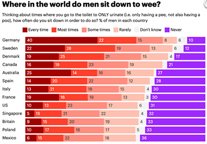 The survey did uncover some surprising cultural differences, with 40% of German men saying they sit down to pee “every time,” in comparison with just 10% of American men.