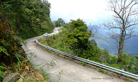 Đường đèo dẫn lên núi, hẹp và quanh co.
