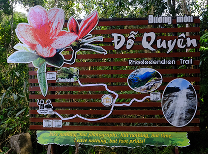 Bảng hướng dẫn tại bãi đậu xe lưng chừng đèo, chỉ lối mòn đi đến thác Đỗ Quyên và thác Ngũ hồ. Bên dưới bảng có hàng chữ : “Take nothing but photographs; Kill nothing but time; Leave nothing but foot prints!” tạm dịch là “Xin đừng lấy gì ngoại trừ hình ảnh; Đừng giết gì ngoại trừ thời gian; Đừng để lại gì ngoại trừ dấu chân!”
