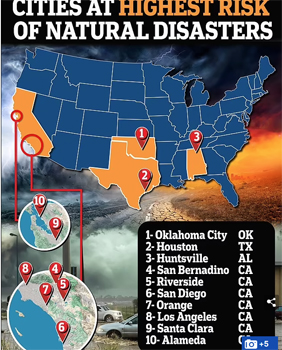 California was home to seven of the 10 highest natural disaster risk zones in the country and the three others are Houston, Texas, Huntsville, Alabama, and Oklahoma City, Oklahoma.