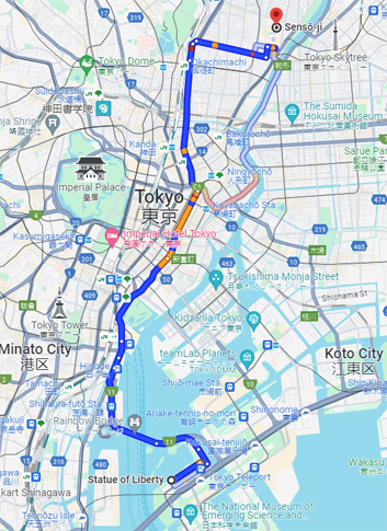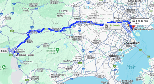 8:48 am. Rời phố cổ Oshino Hakkai, xe đi Tokyo về hướng đông, nơi điểm ghé thăm quan trọng nhất của ngày hôm nay là ngôi chùa nổi tiếng Senso-ji. Đường dài 119 km và thời gian mất chừng hai tiếng.