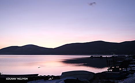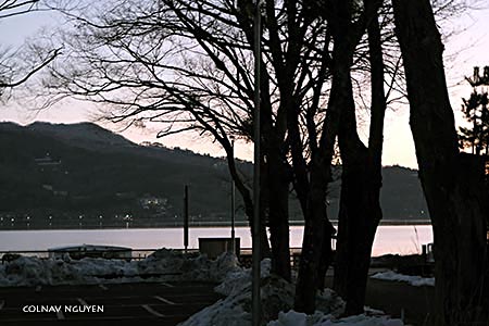 6:09 am. 15.02.2024. Hồ nhỏ trước khách sạn vào lúc rạng đông từ bãi đậu của khách sạn nhìn ra. Tuyết rơi từ ngày nào bây giờ chỉ còn thấy dồn lại một bên, chừa lối cho lưu thông.
