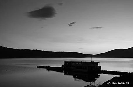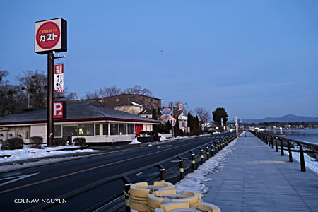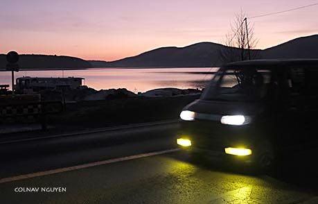 6:13 am. Đường xe hơi và lối đi dành cho xe đạp và bộ hành dọc ven hồ, cả hai cùng men theo bờ hồ chạy về phía mấy ngọn núi xa xa, hướng tôi sẽ đi đến khu làng cổ. Bên kia đường là một quán cà phê, nằm kế khách sạn của tôi. Trời đã sáng hẳn mà ngoài đường vẫn vắng xe và người.