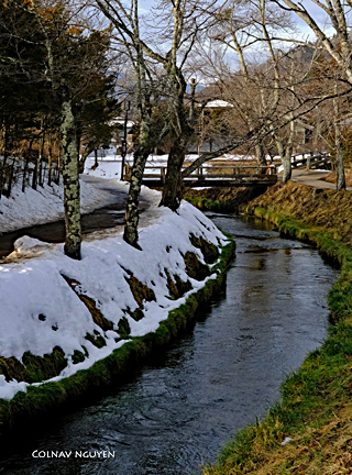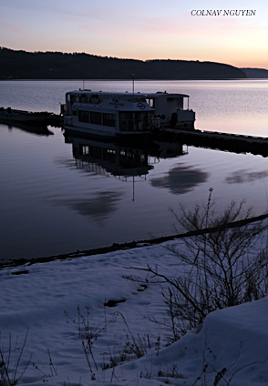 Mấy cụm mây nay lắng vào trong mặt nước hồ. Ven bờ, tuyết vẫn còn phủ đầy. Lúc này thì tôi bắt đầu cảm thấy cóng ở đầu các ngón tay nên luôn thọc vào trong túi áo gió, chỉ khi nào cần bấm máy thì mới rút ra.