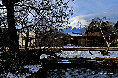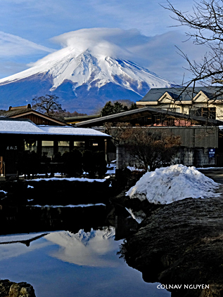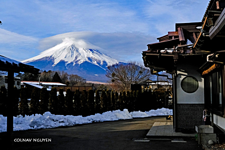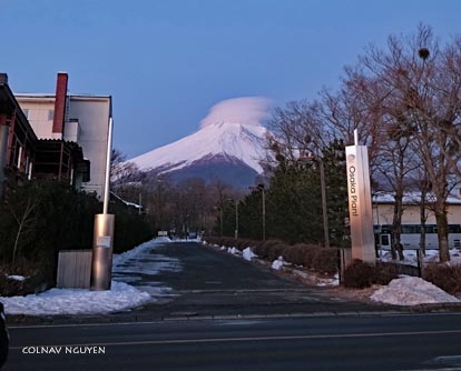 6:17 am. Vừa định băng qua đường để trở về khách sạn thì.. ô kìa kìa.. sừng sững ngay trước lối đi dẫn vào khách sạn: Phú Sĩ đứng đó tự bao giờ, không những vậy sáng nay nó còn mang thêm cái vương miện trên đầu nữa chứ. Té ra suốt đêm qua nó đứng đó, sau lưng khách sạn của tôi mà tôi nào hay. Sáng nay chắc nó cười trêu ngươi tôi suốt thời gian tôi thơ thẩn ngoài hồ nước chứ gì? Chào Phú Sĩ, kẻ mà ta quá quen thuộc từ mấy chục thập niên trước, cám ơn đã đến sớm chờ ta. Hôm nay mi sẽ tiễn ta đi Tokyo một đoạn nhé, càng xa càng tốt.