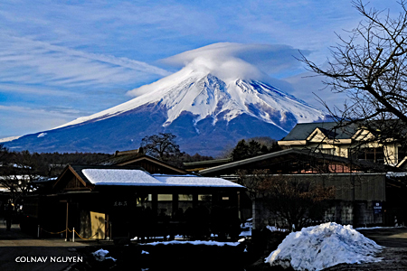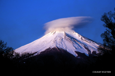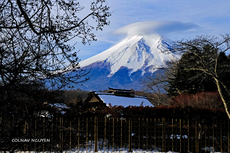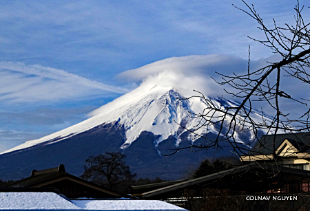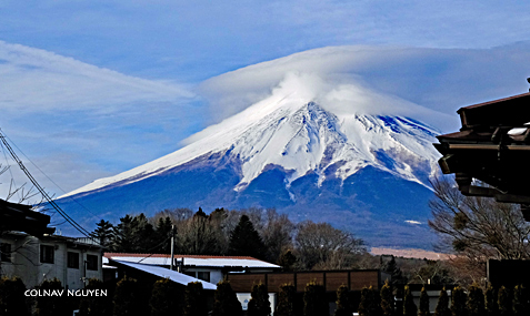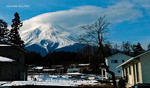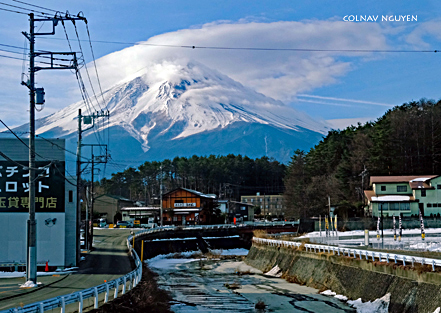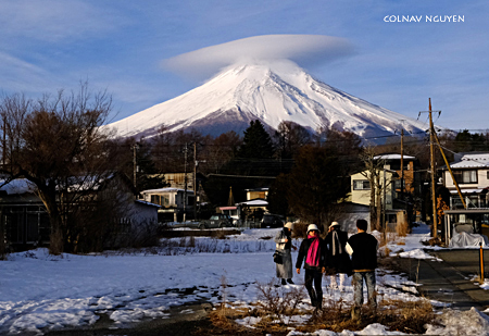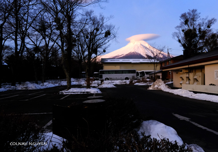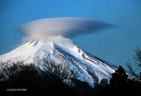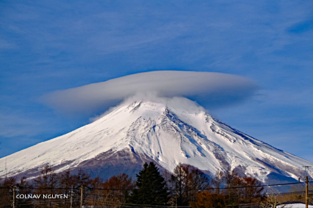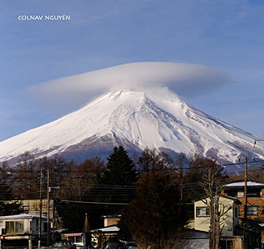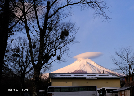 Cụm mây thấu kính (lenticular cloud) trông thấy chiều qua khi ngồi trên xe, không biết bằng cách nào mà sáng nay tụ lại trên chóp của Mt Fuji. Hay Phú Sĩ muốn “surprise” ta, với món hàng đội đầu đặc biệt mới nhận được khuya hôm qua. Thì ra chiều hôm qua ta chứng kiến được lúc món hàng này đang được chở tới.