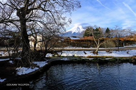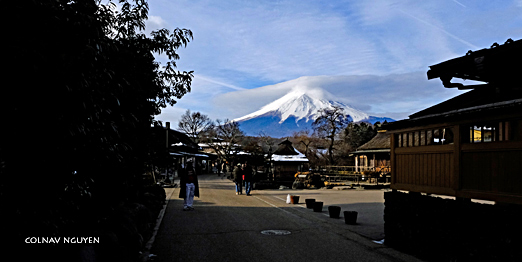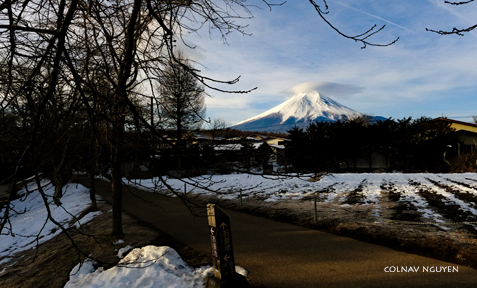 7:56 am. Từ bãi đậu xe, chúng tôi theo một lối nhỏ dẫn vào trong làng, Phú Sĩ đang chờ, nó cách chúng tôi chỉ chừng 15 km.