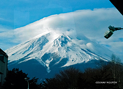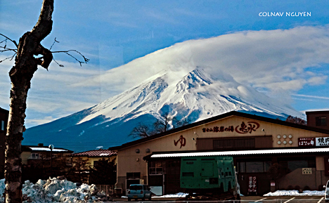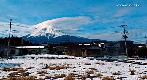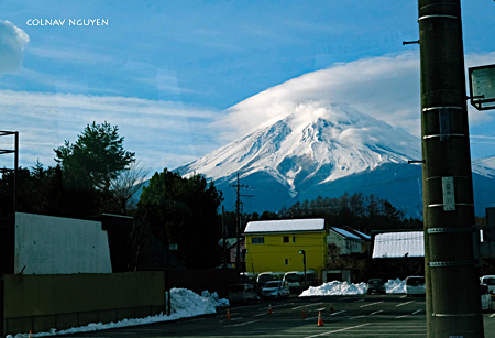8:54 am. Suốt chặng đường sáng nay, Mt Fuji vẫn luôn ở bên khung cửa sổ.Xe tiếp tục chạy và cảnh sắc ở tiền cảnh liên tục thay đổi ngoại trừ Mt Fuji như một tranh nền ở phía sau, không hề đổi thay, có chăng là cụm mây đang ngày càng kéo dài ra thêm về một phía, theo với chiều xe chạy.