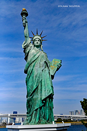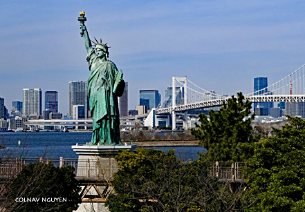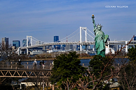 11:18 am. Để có chút hơi hám của TP New York, người ta đưa chúng tôi ghé thăm tượng Nữ thần Tự do Odaiba quay lưng ra vịnh Tokyo, nằm trên đảo nhân tạo Odaiba. Cầu Rainbow chạy về hướng trung tâm thủ đô Tokyo với những tòa nhà cao tầng nổi bật trên nền trời xa xa.