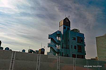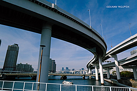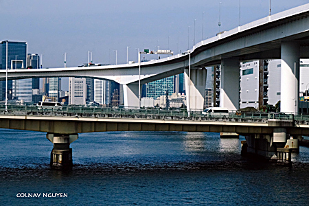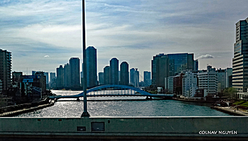 12:10 pm. Cầu vượt, nhà cao tầng, sông Sumida.