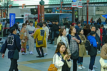 Đám đông ở ngã tư nầy không đi tàu điện ngầm mà đứng đây chờ xe buýt. Một số em mặc đồ truyền thống, có lẽ rũ nhau đi chùa Senso-Ji.