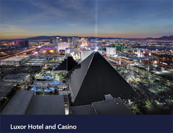 Đêm đầu tiên chúng tôi lấy hai phòng tại khách sạn Luxor ở Las Vegas, một kiến trúc hình kim tự tháp Ai Cập rất nổi bật và bề thế. Từ cửa sổ phòng ở tầng 14 có thể nhìn thấy phi trường ở khoảng cách không xa. Ngon lành vậy đó nhưng giá cả lại bèo hơn so với ở các khách sạn khác nhau của 5 đêm còn lại trên lộ trình.